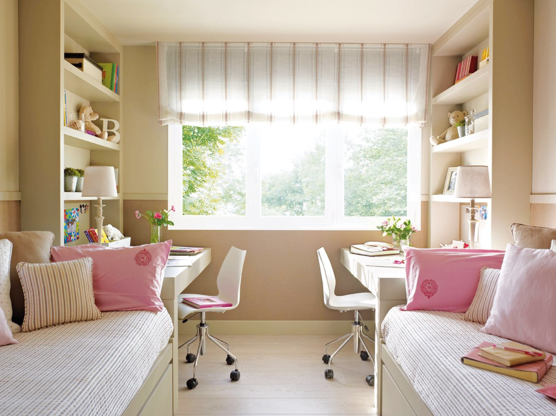 Маленькое пространство комнаты для двух подросших детей допускает исключительно модульную мебель и максимальное использование его по вертикали. Это двухъярусные кровати, диваны-трансформеры, шкафы-купе, навесные полки, мобильные тумбы на колесах, которые прячутся под столы. В стилевом направлении наиболее приемлемы минимализм или хай-тек. Визуально комната увеличивается только благодаря освещению да светлым оттенкам. Наполнение зеркалами для этого недопустимо. Они часто разбиваются во время активных игр и травмируют детей.