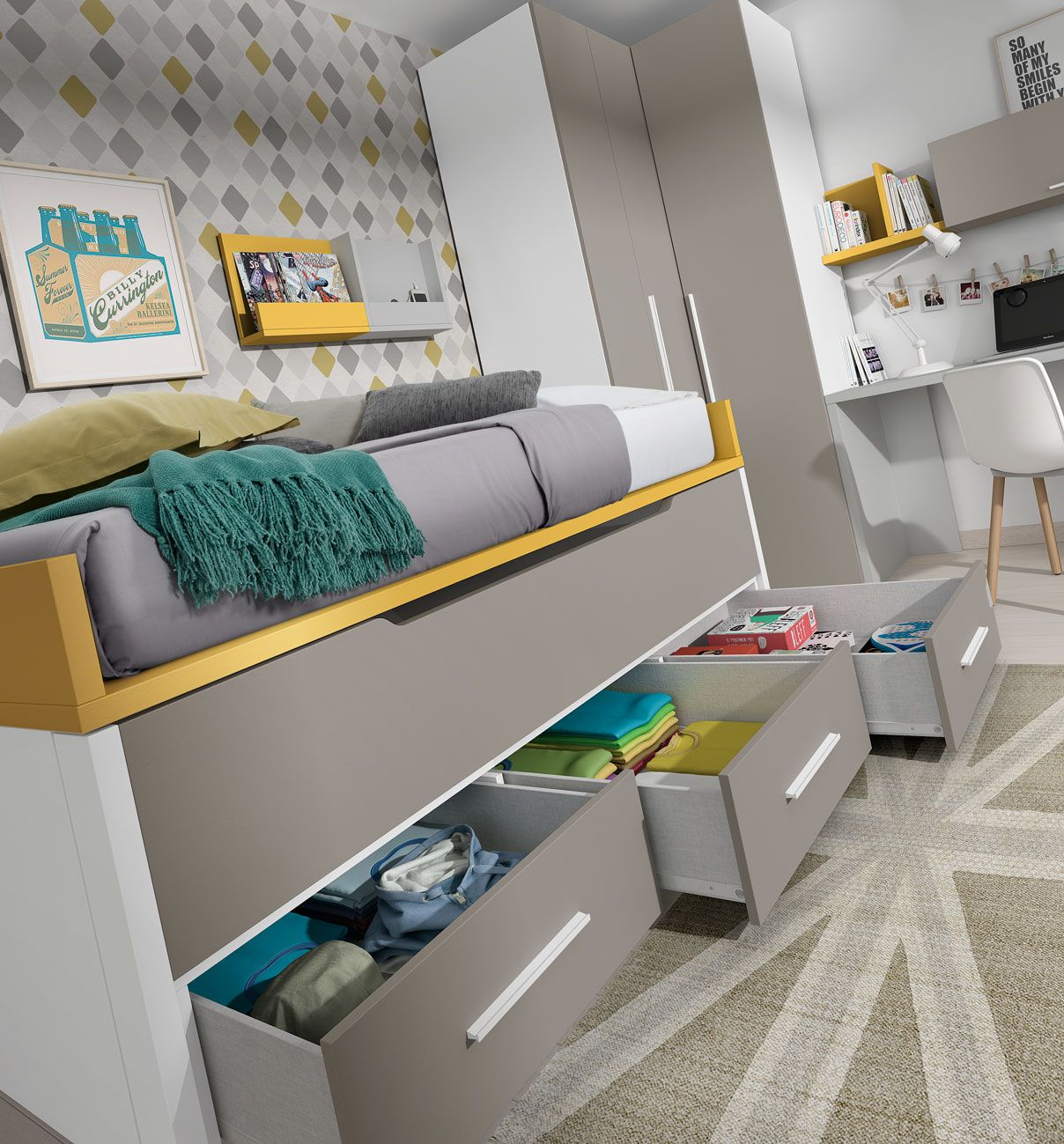 • Выбор спального места зависит от площади помещения. Это отдельно стоящие или двухъярусные кровати, кровать-трансформер с выдвигающимся или раскладным одним спальным местом. Возможны диваны, но со специальным ортопедическим наполнением. Размер спального места желательно подбирать или с запасом из-за быстрого роста подростка, или с возможностью легкого их увеличения.