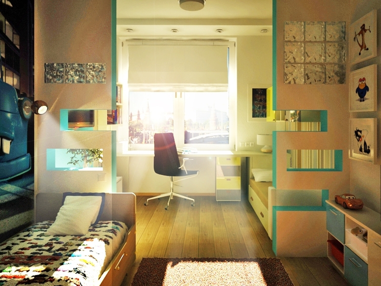 Если Ваши дети уже школьники, комнату нужно будет «условно» поделить на четыре части: место для сна и отдыха, для учебы, игр, и хранения личных вещей. Если же они ещё дошкольники, тогда пока что можно не организовывать место для учебы. Достаточно будет спального места, а также для игры и спортивных занятий. Конечно же, школьникам необходимо достаточное количество места для учебы. Важно, чтобы столы и компьютеры были у каждого свои, чтобы не происходило никаких ни ссор, ни конфликтов. Гораздо сложнее, если дети разного возраста.