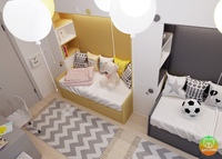 А если детки разного возраста? Тогда игровая зона обустраивается с размахом для малыша, а рабочая (подальше от игровой) для подростка. И придется чем-то пожертвовать, например, установить двухъярусную или подвесную кровать.