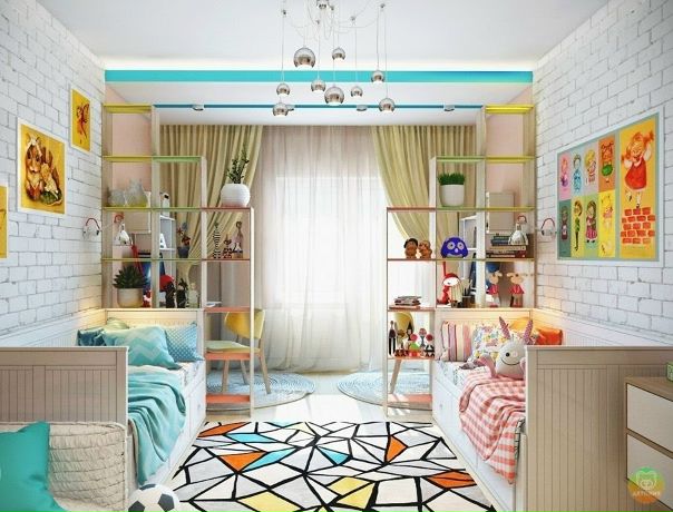 Другое дело, если метраж детской позволяет разделить ее на две равные части. Это наиболее простой дизайн детской для разнополых детей. Именно на одинаковые, чтобы избежать ссор. Тогда, с помощью перегородки делим комнату.