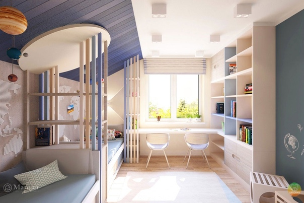 В ясли для двоих детей каждому необходимо организовать удобное место для учебы. Это может быть один общий стол. Отличной идеей станет длинная столешница, расположенная у окна и занимающая всю длину стены.Детям будет не хватать не только места, но и естественного света. Вы можете купить индивидуальные столы. Не забывайте об удобных креслах, которые помогают поддерживать правильную осанку.