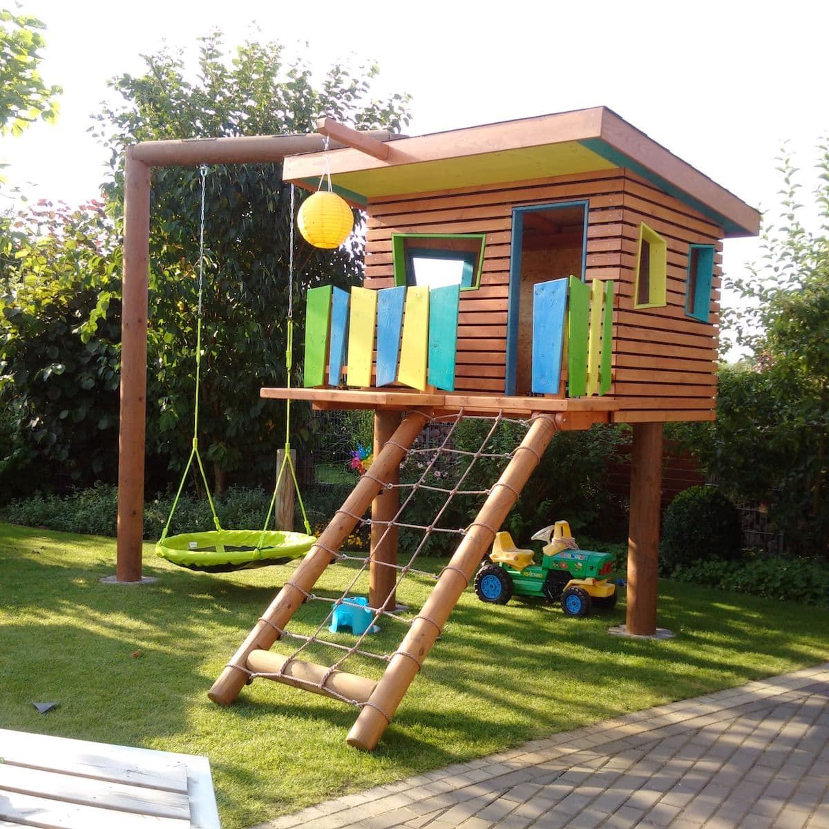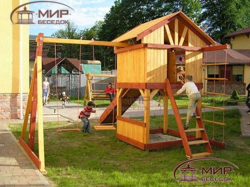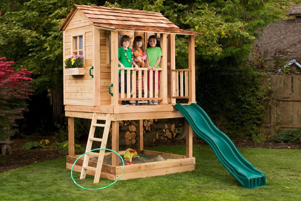 Как правило, в таких зданиях первый этаж занимает веранда с гостиной, а на втором располагается комната отдыха. Особенно интересная идея – это создание двухъярусных домов, в которых отсутствует лестница. Ребенку, чтобы забраться на второй этаж, придется использовать различные приспособления, к примеру, канат. Такие варианты домиков будут не только местом для игры, но и тренировочной площадкой для выработки выносливости, ловкости и координации движений.