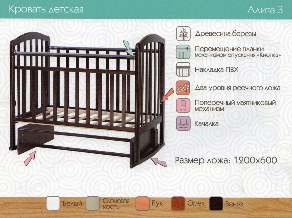 Стоит отметить, что параметр 120*60 см, используемый для обозначения размеров детской кровати классической формы, обозначает габариты спального места, сама кроватка может на 6-10 см быть больше из-за наличия дополнительных элементов – боковин, бортов. Это касается не только упомянутой модели, но и некоторых других видов детской мебели.