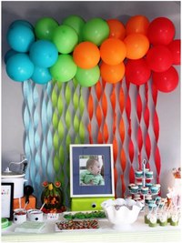 Итак, воздушные шары можно персонализировать с помощью мультяшных картинок. Ленты из крепированной бумаги вьются вокруг стола. Ленты также можно прикрепить к спинкам стульев. Золотые и серебряные шары в форме звезды сверкают в зале. Прямо у входа спроектирована воздушная арка. Завивка лент превратит пространство в рай.