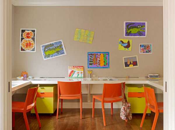 Для детей школьного возраста важно продумать не только зоны для отдыха, но и раздельные рабочие места. Не забывайте о том, что рабочее место мальчика и девочки должно освещаться точечным источником света. Помимо общей потолочной люстры, на столе каждого ребенка обязательно должна стоять лампа либо над столом закреплен точечный светильник (бра).