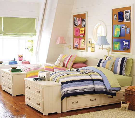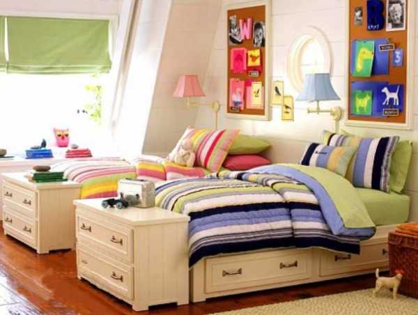 Для отделки комнаты хорошо подойдёт гамма белого и бежевого цветов. Также можно комбинироваться другие яркие цвета, чтобы визуально разделить пространство. Организуйте место для девочки и для мальчика, у каждого должен быть свой уголок, личное пространство, где он сможет, например, читать или рисовать.