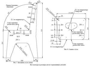 Чертеж деревянного стула из фанеры выполняется по определенным размерам. Они должны соответствовать росту ребенка, поэтому лучше всего воспользоваться габаритами для детских стульчиков из приведенной ранее таблицы. После выполнения чертежа все действия идут по такому алгоритму: