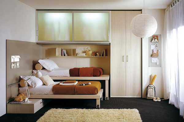 Популярным с точки зрения экономии места в комнате является размещение двухъярусной кровати. Одной из разновидностей двухъярусных кроватей является кровать с выдвижным спальным местом. Такой вариант идеально впишется в комнату с низкими потолками. А чтобы малыши не ссорились, предложите им периодически меняться местами.