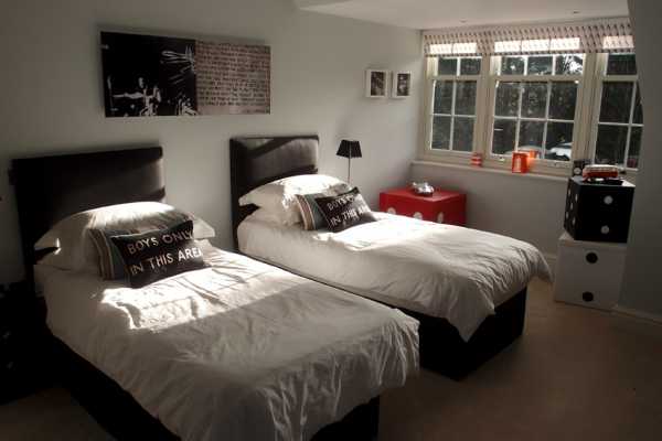 Яркая комната для двоих детей с красным оттенкомДети до 13 уже становятся взрослее и рассудительнее, поэтому зонирование их пространства должно быть максимально полезным. Большую роль для школьников играет рабоче-учебная зона, не стоит экономить на хороших письменных столах и тумбочках для хранения книг и тетрадей. Спальные места могут быть сделаны в виде двухъярусной кровати, которая экономит место и дает возможность каждому ребенку иметь личную зону, где его никто не будет отвлекать.