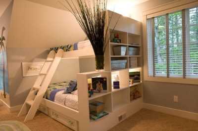 Двухъярусная кровать в комнате для двоих детейДля двоих детей, если позволяет место, хорошо разделить пространство между кроватями перегородкой, чтобы у обоих было личное пространство, где можно заниматься своими делами. На перегородке могут размещаться полочки или зеркала, когда комната обустраивается для девочек.