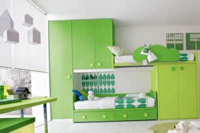 Детская комната для двоих детей в зеленом цветеЗначительную роль играют аксессуары — полочки, тумбочки, фоторамки и картины. Все это добавляет комнате комфорта и легкости. Существует много интересных дизайнерских вариантов комодов, которые идеально впишутся в любой интерьер.