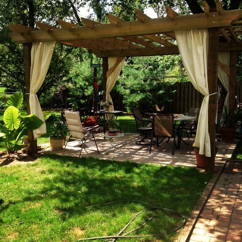 Великолепная, но ржавая виноградная беседка оживает благодаря новой железной беседке и патио из переработанного кирпича. Простые белые занавески — идеальный романтический (и доступный!) завершающий штрих.