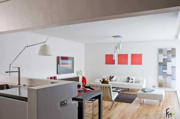 Например, эта гостиная-столовая-кухня, оформленная в современном стиле, склоняющемся к минимализму, кажется еще просторнее и легче, благодаря белоснежной отделке стен, потолка и светлой породе дерева, использованного для напольного покрытия.