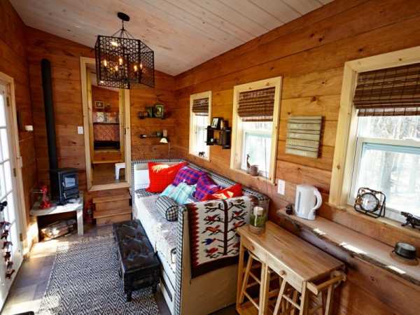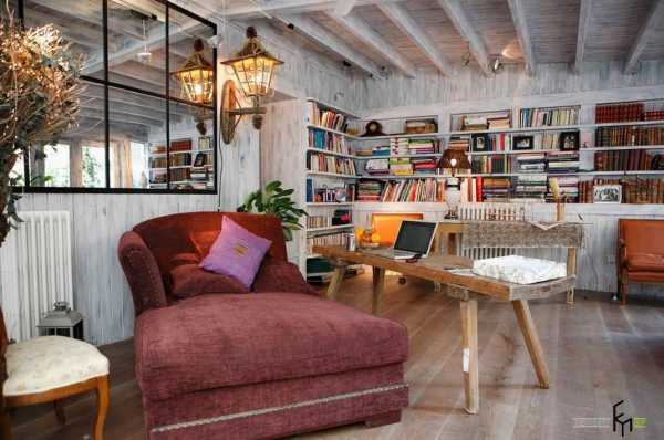 Эта гостиная с домашней библиотекой в стиле кантри вместила и зону для работы. Оформление деревянных стен и потолка с нарочитыми потертостями, использование в интерьере мебель грубой, не отшлифованной сборки, создало атмосферу деревенской комнаты для любителей чтения.