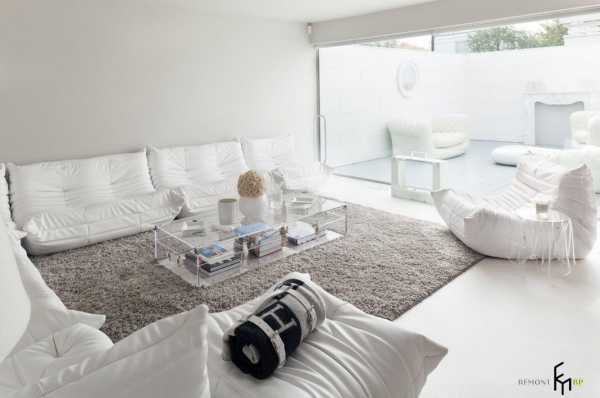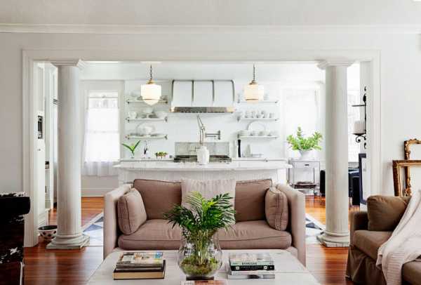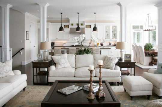 Светлая, просторная, по-королевски шикарная гостиная в пастельно-белых тонах способна украсить любой загородный дом.