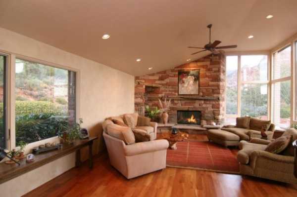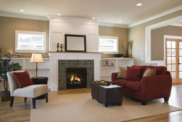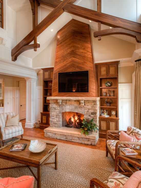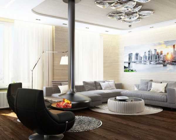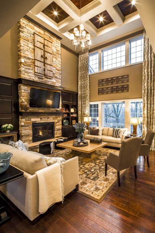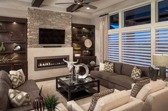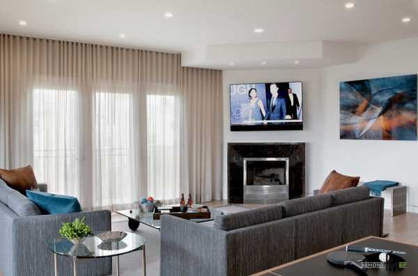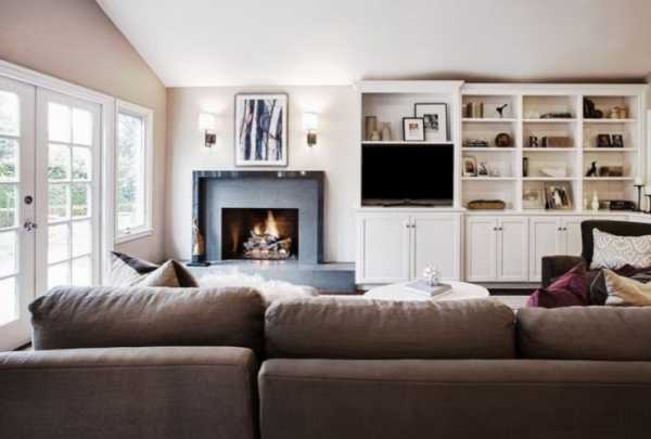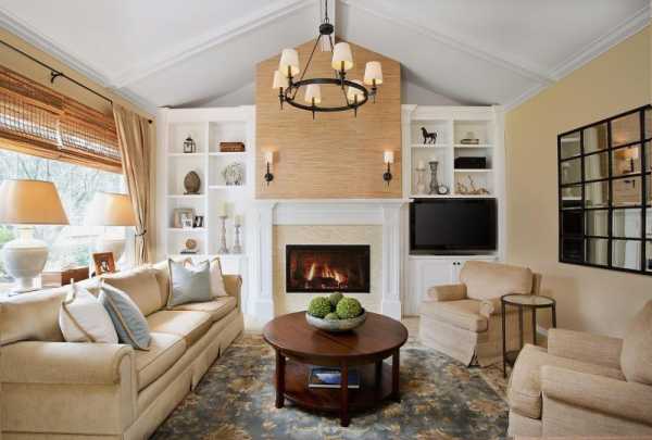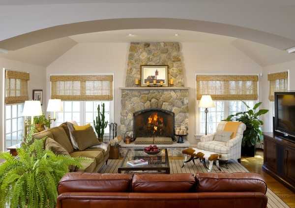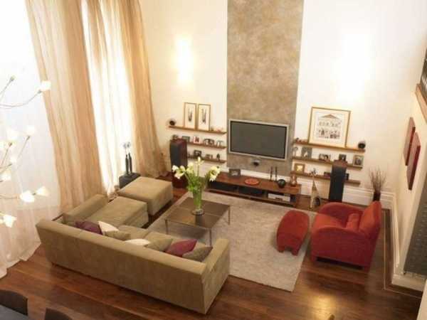 - Обязательно создайте центр зала, от которого будет из ходить весь интерьер. К примеру, это может быть камин или большой телевизор.