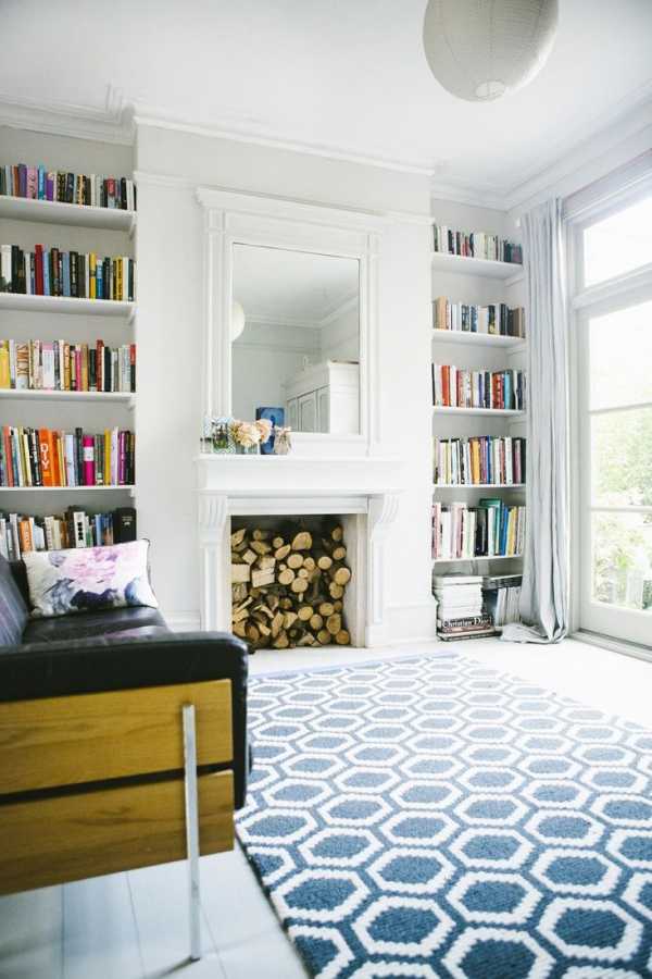 Яркие, насыщенные цвета предметов декора и обивки мягкой мебели отлично выглядят на фоне белоснежной отделки помещения гостиной с небольшой библиотекой.