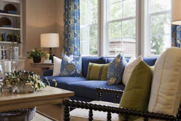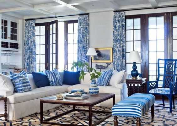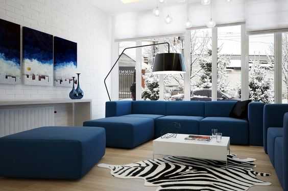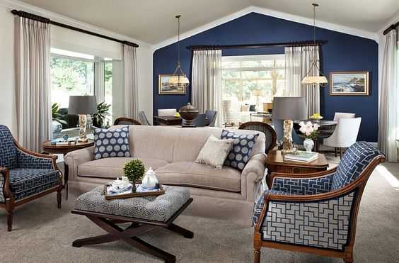 Вариантов для синего акцента в интерьер большой гостиной привеликое множество. всевозможные оттенки синего весьма универсальные и подходят ко многим цветам. На фото сверху мы видим как умело используется даже синяя полоска в комбинации с бежевым создается изящный и строгий силуэт всей гостиной. Подробнее о синих тонах, читайте в статье: «Интерьер в синих цветах».