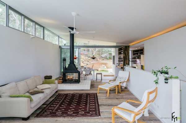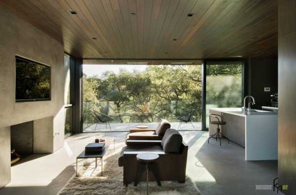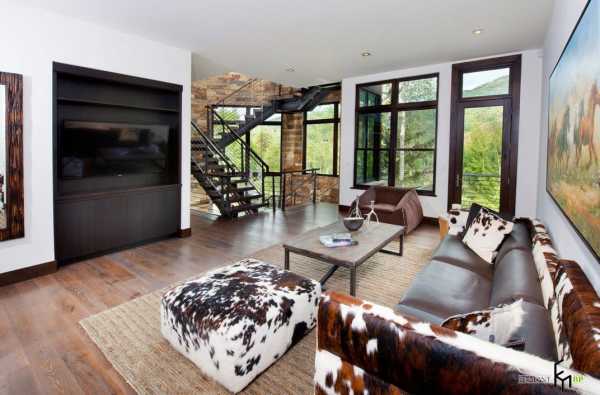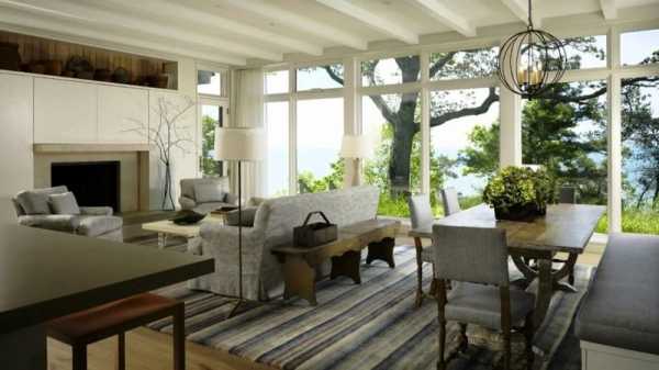 А эта гостиная в загородном домовладении выполнена в стиле, близком к минимализму. На самом деле, что еще нужно, кроме дивана и телевизора для создания интерьера общей комнаты, особенно, если за окном такая красота.