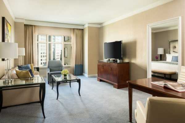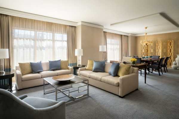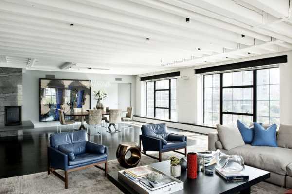 В дизайне большой гостиной в пентхаусе на фото используются яркие синие акценты. Диванные подушки, наряду с перекликающимся с ними по цвету светильником в кухне-столовой, хорошо освежают пространство. При этом, оттенки синего и бежевого в этом интерьере комбинируются таким образом, что они не создают холодного сочетания.