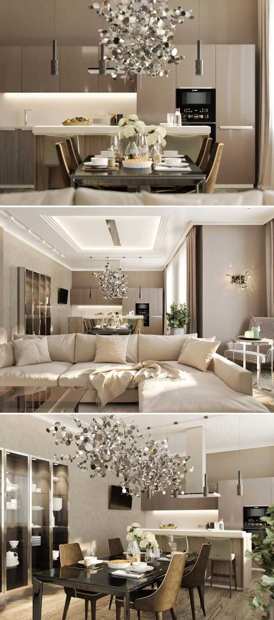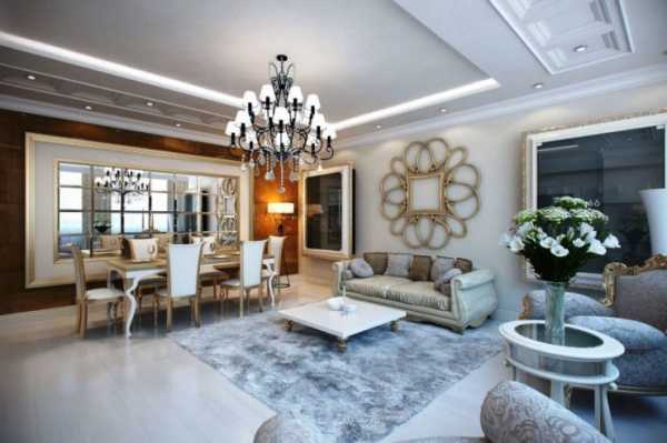 Игра контрастов – основная концепция интерьера этой по-праздничному оформленной гостиной, включающей весь необходимый для комфортного отдыха набор элементов. Контрастное оформление поверхностей комнаты в купе с дорогой меблировкой и блестящими элементами декора создают действительно интересный и одновременно роскошный дизайн гостиной-столовой.