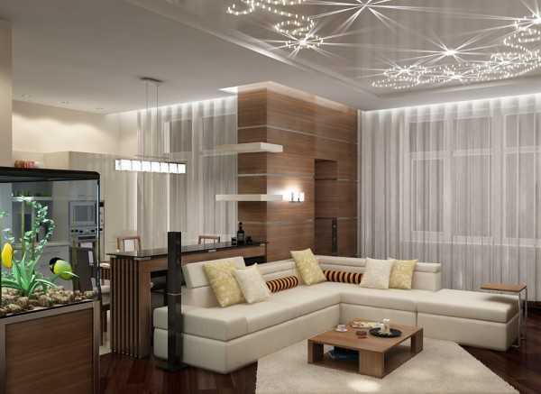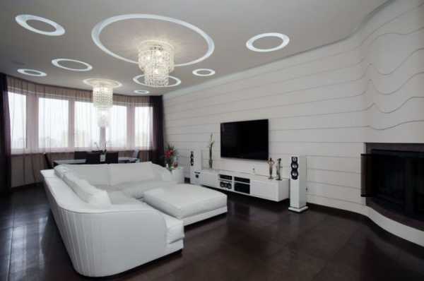 Используйте в интерьере «правило» контраста – если светлый потолок и стены сделайте темный пол и мебель в большой гостиной.
