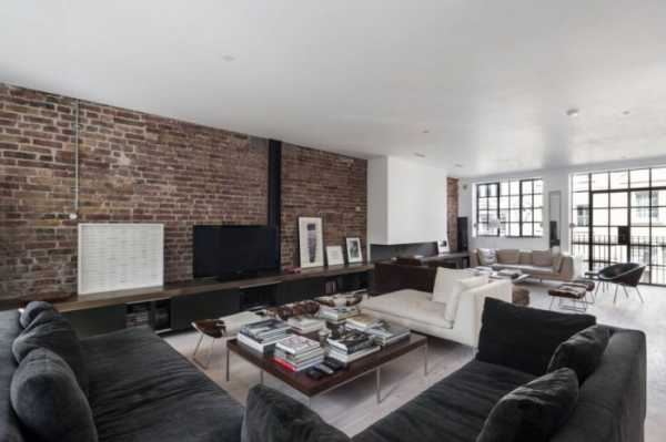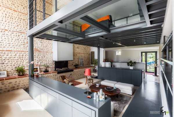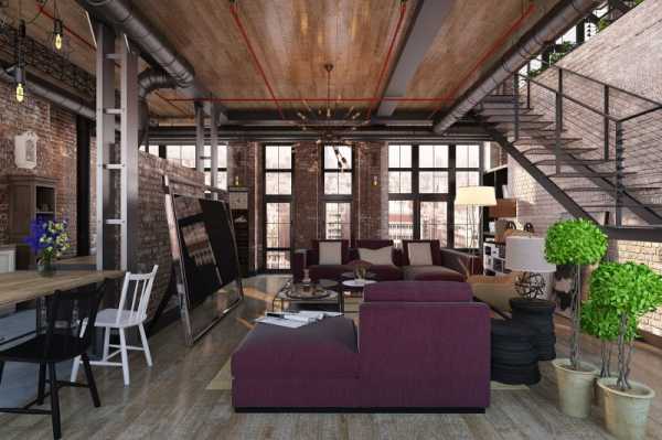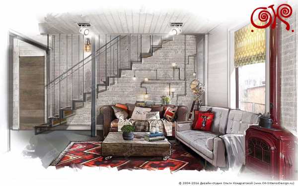 В дизайне интерьера стиль лофт в последние годы пользуется повышенным спросом. Отчасти это обусловлено его доступностью. Для создания комфортабельного лофтового пространства обычно ненужно много средств. В дизайне большой гостиной в лестничном холле можно увидеть такие элементы стиля лофт, как кирпичная кладка, аутентичная печь-буржуйка, высокое панорамное окно и своеобразная инсталляция из труб и лампочек. Получилось вполне креативное лофтовое пространство со своей концепцией.