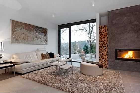 Камин, мягкие диваны и кресла, стеклянные стены, за которыми видна зелень – что еще может быть приятнее для загородной жизни?