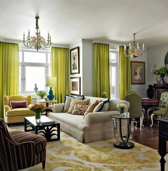 Рассмотрим некоторые из них. На фото интерьеры больших гостиных с зелеными акцентами: