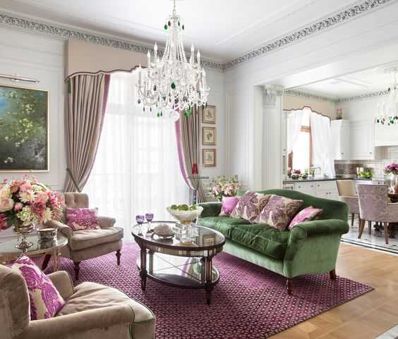 Смотрим идеи больших гостиных с фиолетовыми акцентами: