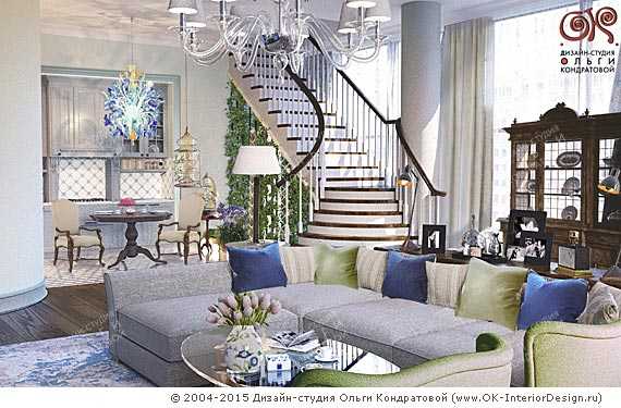 Не секрет, что классике требуются просторные помещения с высокими потолками. Поэтому большая гостиная — это прекрасная возможность поэкспериментировать с классическим стилем. В 2017 году в проектах Студии Ольги Кондратовой можно было встретить помещения, решенные в английской классике. Например, в представленном на фото выше дизайне большой гостиной используются элементы стиля, пришедшего к нам из респектабельной Великобритании. Это и мебель с «каретной» стяжкой, и паркет, уложенный «ёлочкой», и уютный камин, без которого не обходится гостиная ни одного английского джентльмена.