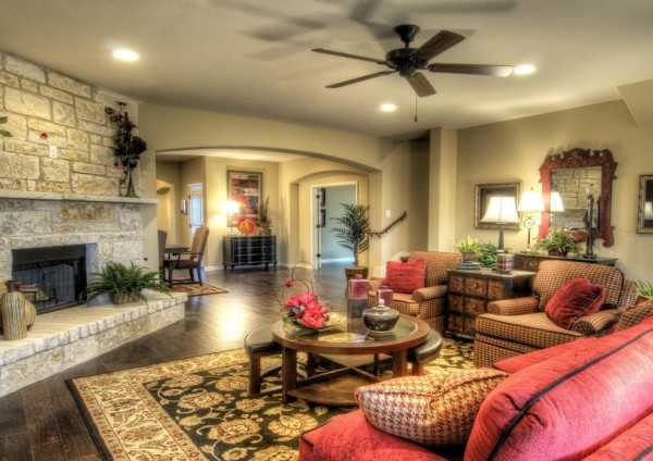 Для дизайна больших семейных комнат, находящихся в загородных домовладениях, характерно использование элементов кантри даже в ультрасовременном интерьере. Близость к природе обуславливает присутствие натуральных материалов – древесины различных пород, камня всевозможной степени обработанности. Подобные отделочные материалы и элементы мебели и декора, из них произведенные, помогают создать уютную атмосферу большой комнаты для всей семьи.
