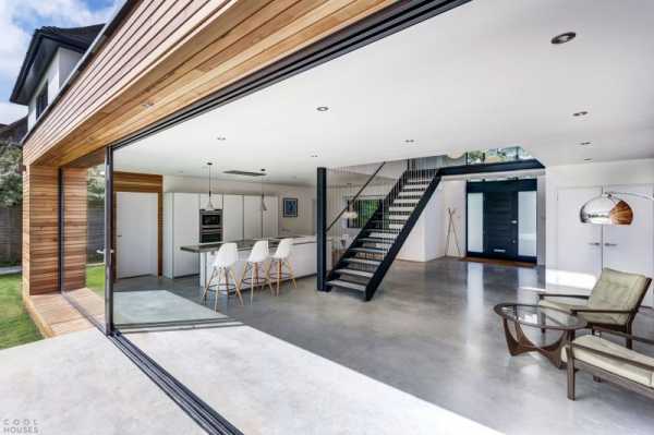Большие книжные стеллажи в этой просторной гостиной соседствуют с кухонной и обеденной зоной, поэтому сложно сказать для чего в первую очередь обустраивалась комната – для приготовления пищи, ее поглощения или чтения книг из обширной библиотеки в мягкой вместительной зоне. Кажется это помещение в современном стиле универсально и способно организовать досуг для большого количества жильцов и их гостей.
