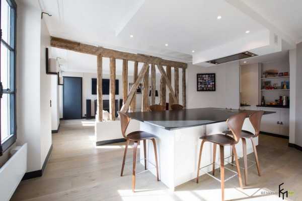 Пожалуй, только такое просторное помещение с высоким потолком, способно выдержать присутствие темного, почти черного цвета. Безусловно, такое внедрение элементов темной палитры, потребовало отделки поверхностей комнаты почти в белоснежных тонах.