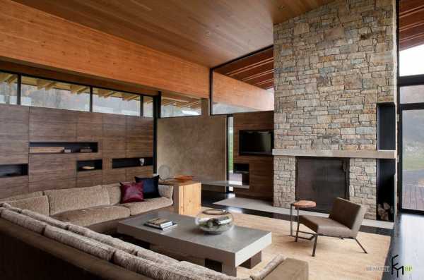 Присутствие камина в загородной гостиной – почти обязательный атрибут, создающий ассоциации с семейным очагом, теплотой и уютом. А облицовка пространства камина с помощью камня – один из самых распространенных вариантов презентации этого координационного центра гостиной. В кампании с деревом, которое активно применялось для обустройства большой комнаты, удалось создать действительно удобную, комфортную обстановку, не смотря на обилие четких, очень геометричных и даже жестких поверхностей в интерьере.