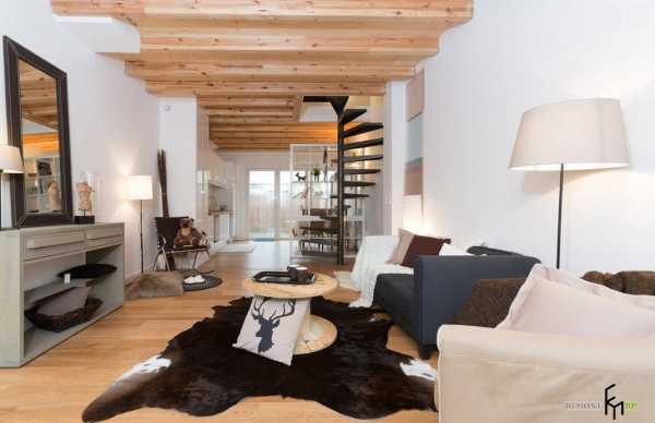 Четно-белая палитра интерьера разбавлена теплыми древесными оттенками отделки потолка и пола, необычный журнальный столик, в форме большой деревянной катушки, дополнил атмосферу модерновой гостиной.