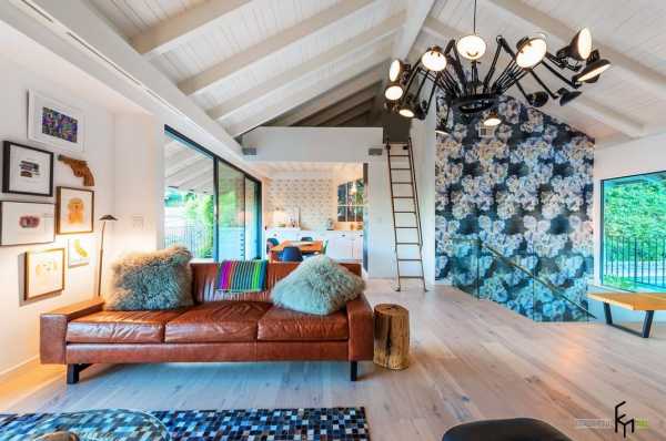 Перед вами еще один пример гостиной с невероятно просторным помещением, высокими потолками и наличием верхнего уровня. Эклектичный дизайн интерьера нуждался в отделении зон кухни и столовой от общего помещения гостиной с помощью ширмы-стеллажа, в которую удачно была интегрирована TV-зона. Интерьер завораживает обилием элементов из различных стилевых направлений. Деревянные элементы гармонично соседствуют с индустриальным декором и ретро-стилем меблировки.