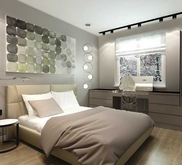 В комнате для сна используют спокойные тона и мебельный минимум. Большая часть помещения будет занята спальной зоной, напротив нее можно поставить комод или узкую тумбу под телевизор, вдоль стены – шкаф. При наличии балкона некоторые объединяют его с комнатой, тем самым увеличивая площадь.