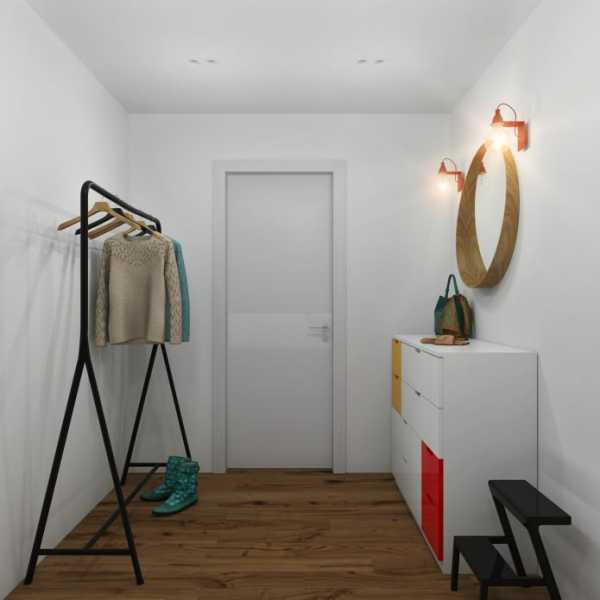 Комод, зеркало и напольная вешалка для одежды определяют функциональность прихожей. Яркие цветовые акценты хорошо выделяются на белом фоне и придают интерьеру индивидуальность.