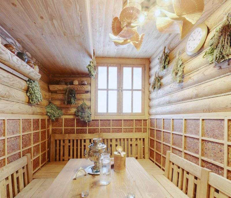 В такой бане можно устанавливать грубоватые лавочки, большие столы, буфеты, печку-каменку. Для создания необходимой атмосферы не следует забывать и о мелочах: деревянных ковшиках, скатертях с вышивкой, старых самоварах и так далее. Помещения в русской бане можно украшать, используя веники.