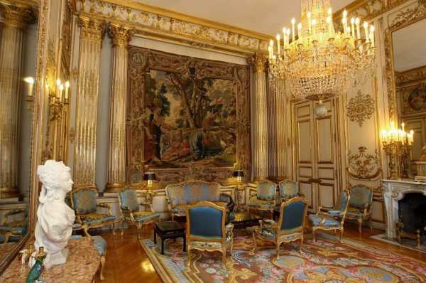 Богатую отделку: молдинги на стенах и потолке, гобелены, лепнину