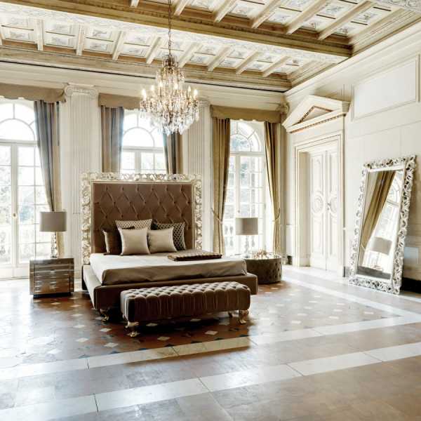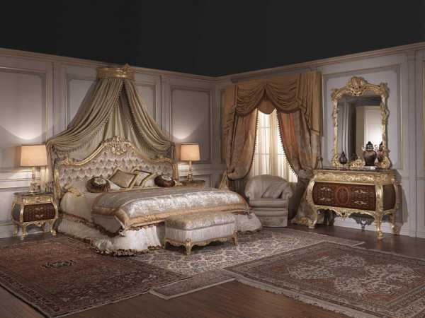 Интерьер спальни в стиле барокко отличается роскошью и большим пространством, внутри которого размещаются королевские покои.