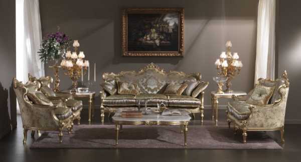 Мебель для стиля барокко отличается уникальностью, длинными витыми ножками и золотой фурнитурой.