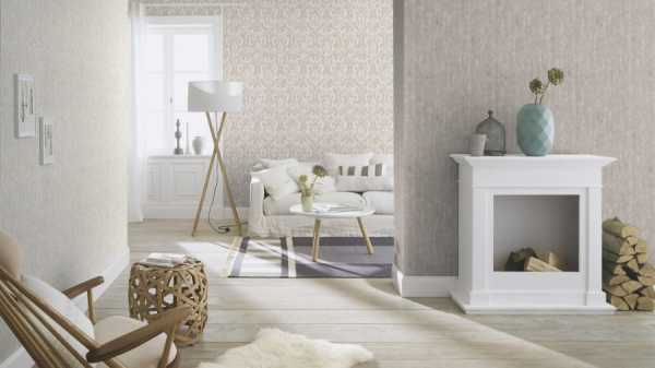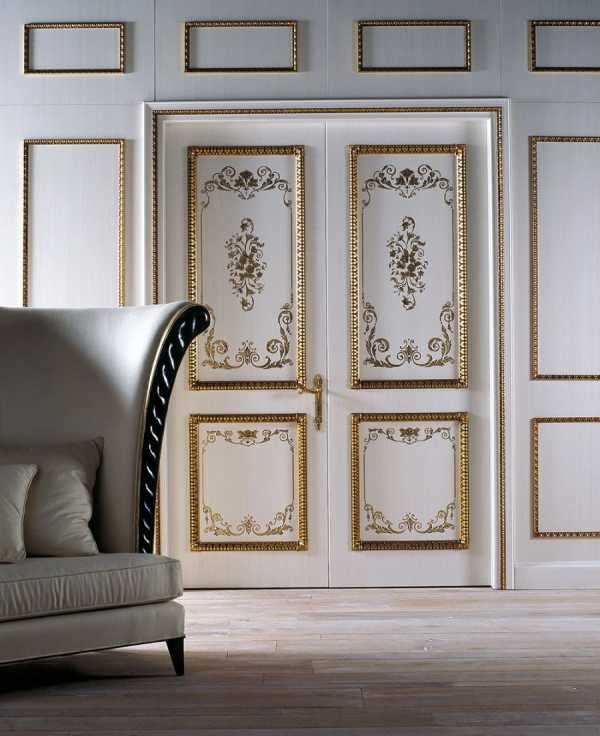 3. Применяют принцип «белое на белом». Для это выбирают дорогие обои с шелкографией или тиснением. Ними оформляют квадраты или прямоугольники на стене, заключенные в позолоченные лепные рамы. Стену вокруг них красят белой матовой краской. Все лепные детали потолка и стены выкрашивают золотой акриловой краской. Порталы украшают белыми скульптурами в театральных позах.