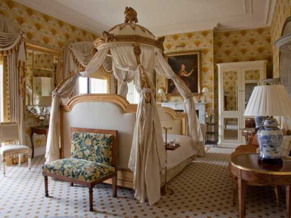Текстиль украшают подхватами, золотой вышивкой, кистями, бантами, брошками. В спальне создают образ королевского будуара с помощью роскошного текстильного оформления. Стеганное атласное покрывало, укрывающее кровать, дополняют декоративными подушками с оборочным краем. На пол укладывают натуральный ковер с рисунком. Уголок для чтения и чаепития меблируют мягким креслом и собой с шелковой обивкой.