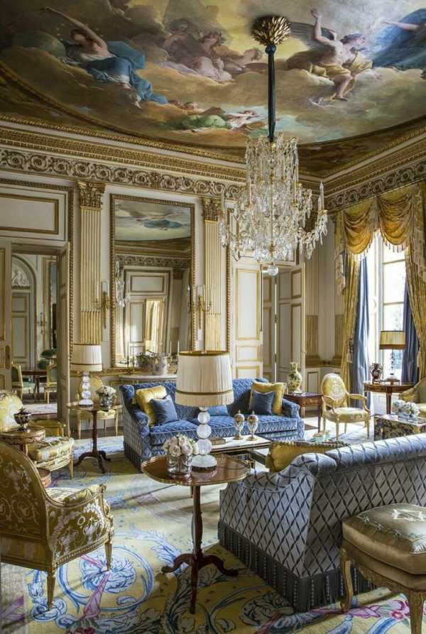 4. Потолок является естественным продолжением стен, украшения которых плавно переходят на поверхность потолка. Потолок украшают живописью, лепниной, фреской. Роскошные люстры с хрустальными подвесами дополняют элегантный и величественный вид.