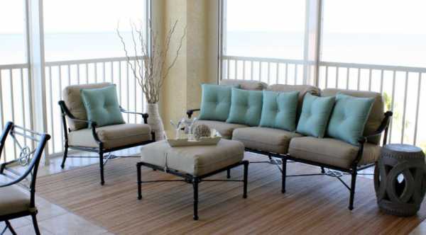 В первую очередь при оборудовании учитывают перемену погодных условий. Для холодного балкона выбирают меблировку из материалов, устойчивых к влаге и температурным перепадам. В качестве декора используют накидки из ткани и подушки, которые в непогоду, с легкостью можно убрать в дом.