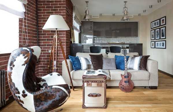Современный лофт подходит для творческих натур. Например, можно использовать данное интерьерное направление при продумывании интерьера гостиной. Одну из стен можно оставить в первозданном виде, не используя отделки. Дополнить образ помогут книги, картины, расставленные по всей комнате, массивные осветительные приборы.