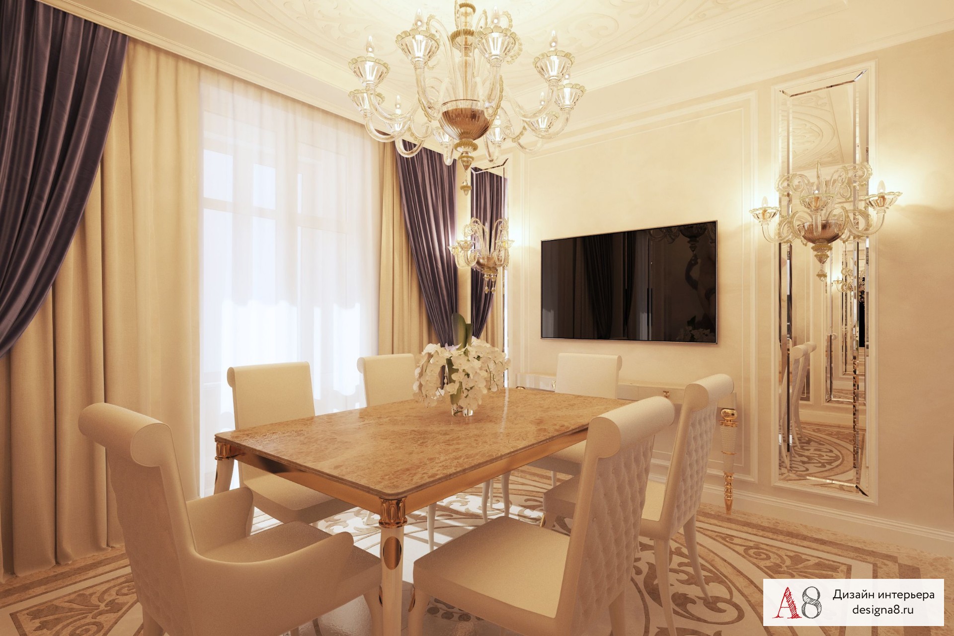 Рассмотрим фото дизайна типичной четырёхкомнатной квартиры классического стиля оформления: наличие строгих чётких линий, симметричное расположение предметов, отражающееся цветовым решением и аксессуаров декора.